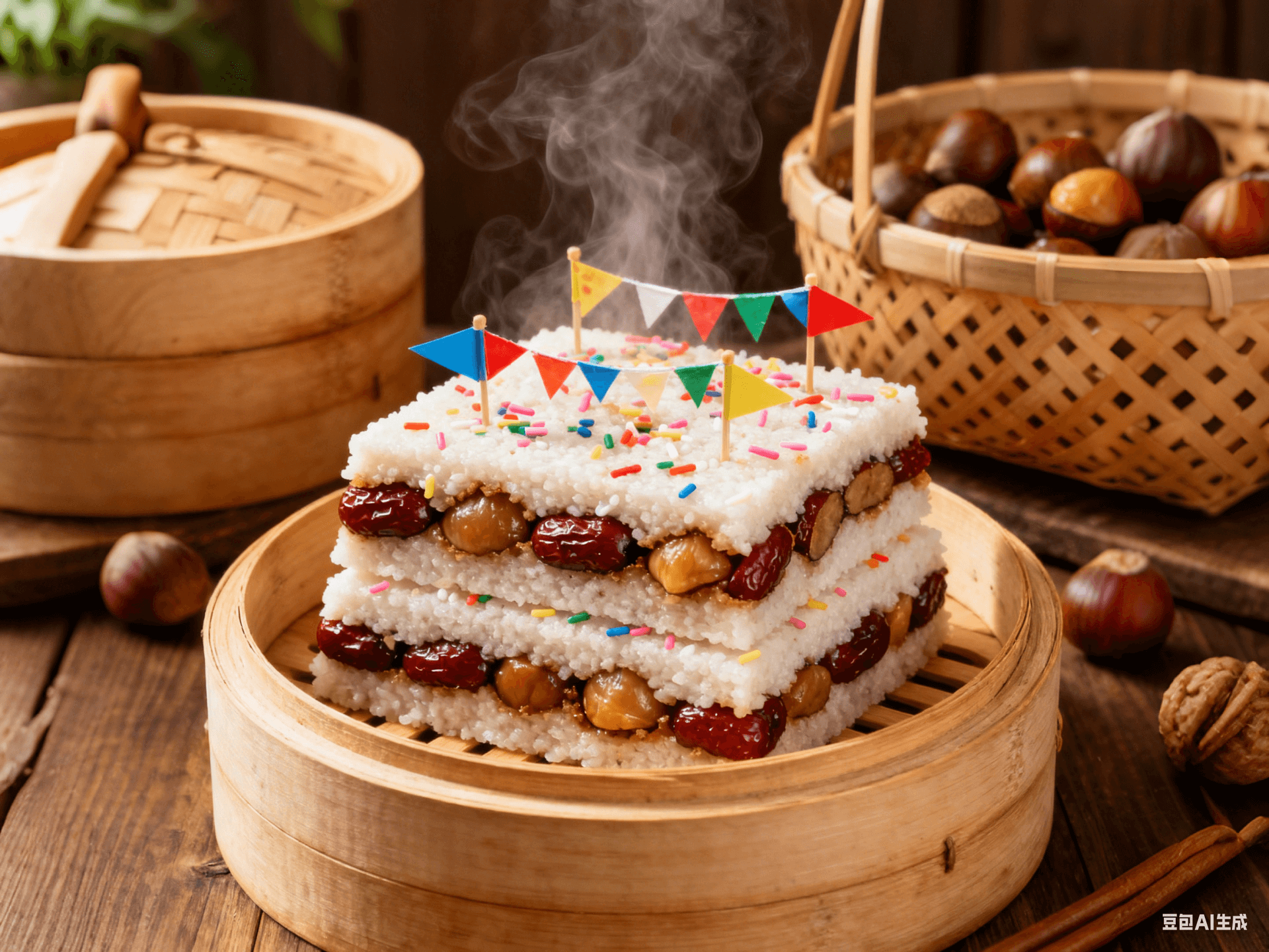 重阳糕又称花糕、菊糕、五色糕,制无定法,较为随意。讲究的重阳糕要做成九层,像座宝塔,上面还做成两只小羊,以符合重阳(羊)之义。