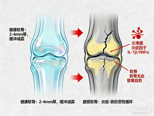 随着年龄增长、肥胖、创伤或过度使用,软骨细胞逐渐凋亡,细胞外基质降解加速,软骨表面出现裂隙、变薄甚至剥脱。此时,关节滑膜会释放炎症因子(如IL-1β、TNF-α),进一步加剧软骨破坏,形成“炎症-损伤”恶性循环。