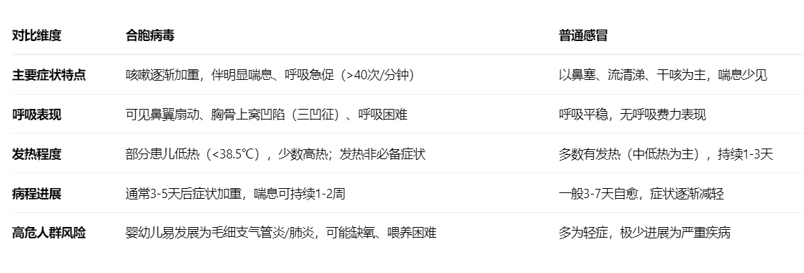 合胞病毒感染初期症状与普通感冒(多由鼻病毒、冠状病毒等引起)高度相似,均可能出现发热(多为低热)、鼻塞、流涕、咳嗽等表现,但两者存在重要差异: