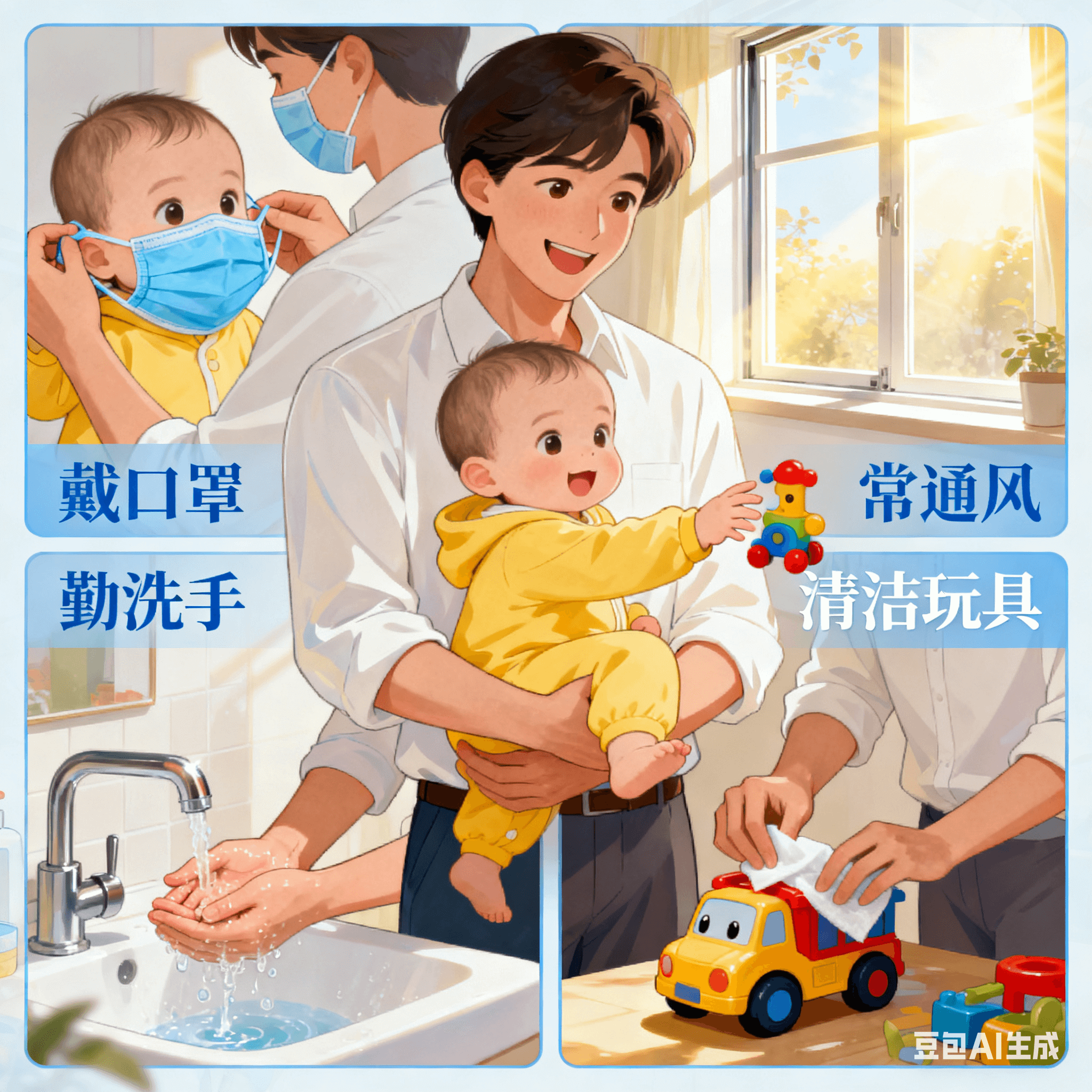戴口罩:在人群密集场所(如医院、商场),建议大人和孩子均佩戴口罩(1岁以下婴儿不宜戴,需通过看护人防护间接保护)。