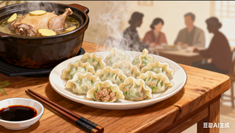 老话说“立冬不端饺子碗,冻掉耳朵没人管”,饺子形似耳朵,传说吃了能保护耳朵不被冻伤。馅料讲究应季:韭菜鸡蛋馅鲜嫩清爽,羊肉胡萝卜馅浓香暖身,连擀皮都要揉得筋道些,“好吃不过饺子,舒服不过躺着”,一口热乎饺子下肚,连呼出的白气都带着满足。