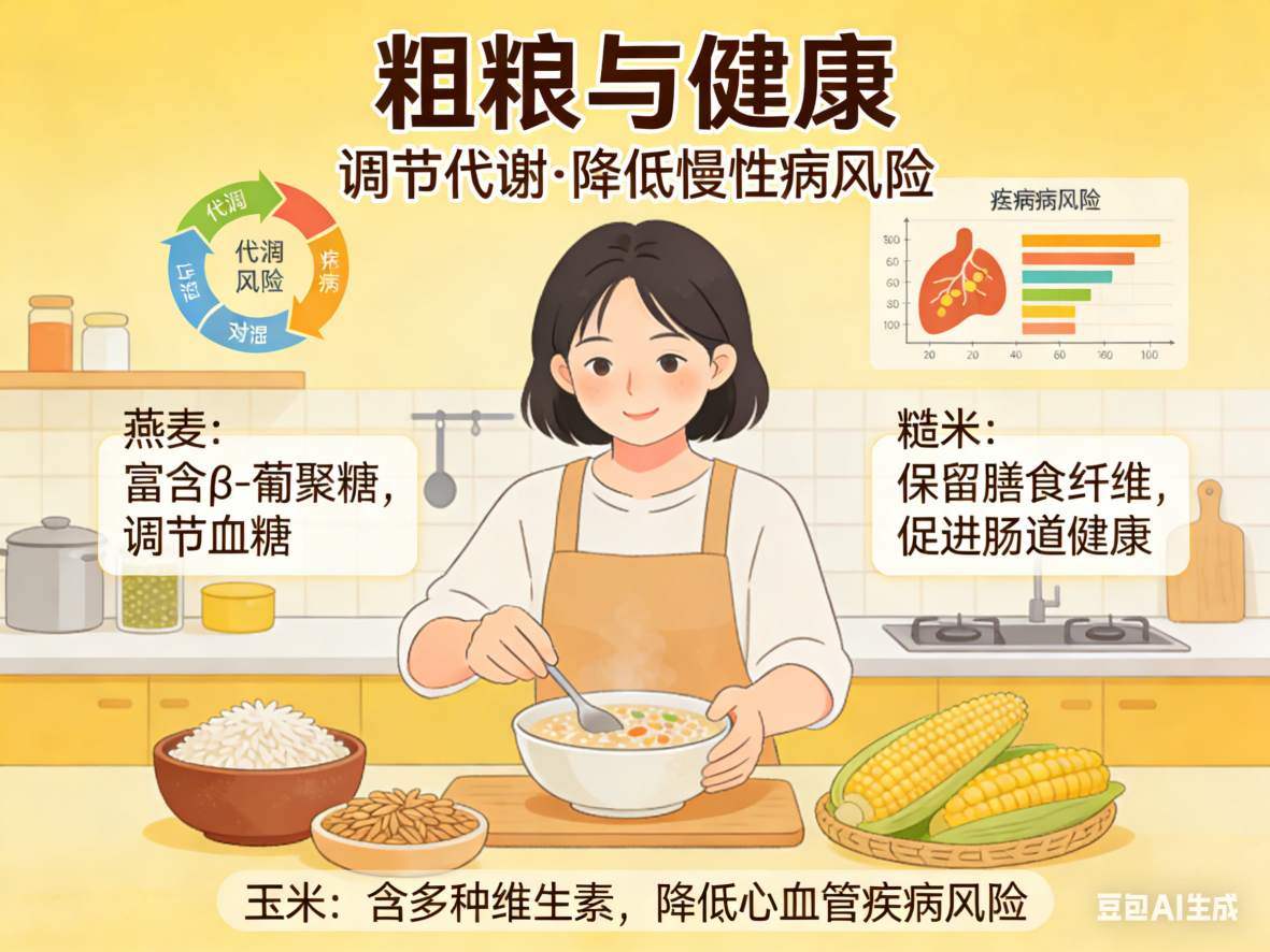 粗粮中的膳食纤维能促进肠道蠕动,预防便秘,并吸附肠道内的有害物质排出体外。例如,玉米中的纤维素含量是精米面的4-10倍,有助于降低结直肠癌风险。