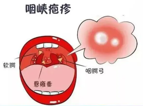 口腔疱疹或溃疡,常见于软腭、扁桃体、悬雍垂(小舌头附近),形成灰白色小疱疹,周围有红晕,破溃后形成溃疡。