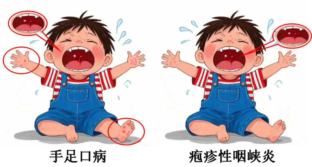 ⚠️ 注意:疱疹性咽峡炎和手足口病是“亲戚”,但疱疹性咽峡炎通常只在口腔出现疱疹,而手足口病还会在手、足、臀部出现皮疹。