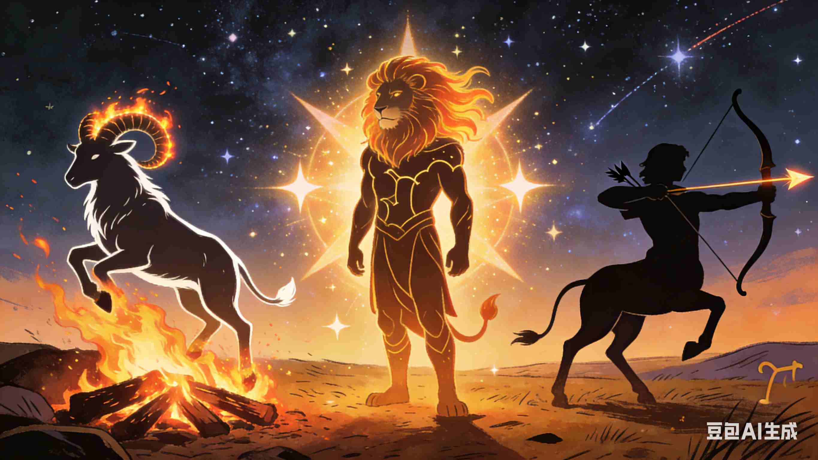 火象星座是宇宙的"发动机"。他们像一团跃动的火焰,永远在追逐光与热——白羊座的冲劲是刚点燃的篝火,狮子座的骄傲是燃烧的恒星,射手座的乐观则是穿透云层的阳光。