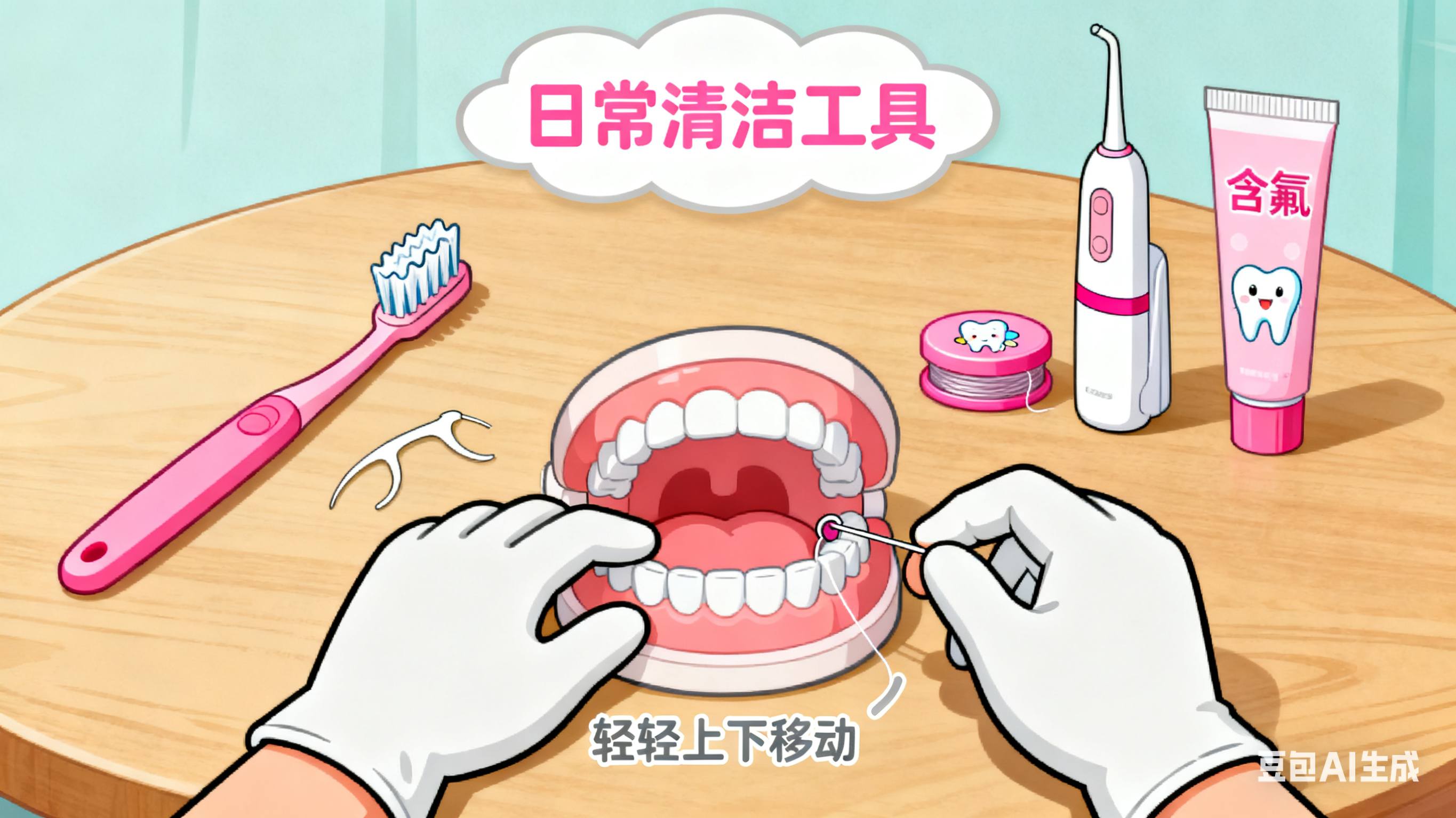 辅助工具:牙线(清理牙缝)、冲牙器(冲洗牙龈沟)、舌刮(清洁舌背)都是刷牙的重要补充,能减少菌斑和食物残渣的残留。